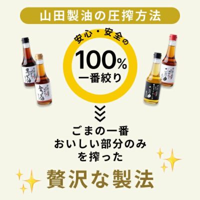 山田製油の定番ごま油。良質な白ごまを使用し、製法も創業当時のまま。一番搾りの圧搾法で添加物や薬品を一切使わず職人が丁寧に作っています。職人がマニュアル無しで、季節や天候により一番美味しくなるタイミングを見極め仕上げます。焙煎から精製まで、約一ヶ月の工程を、約80年変わることなく守り続け、搾るのは一度だけ、美味しいところだけを製品にしています。飲めるほどまろやかな油です。そのまま「生」で香りづけや仕上げ油、また調理油として万能にご利用下さい。
