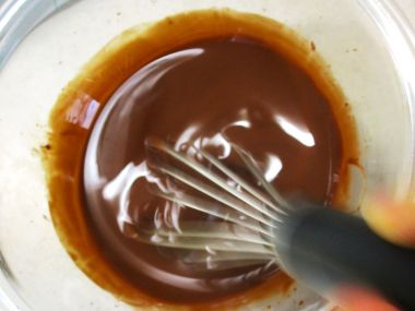 ①耐熱ボウル(電子レンジOKのボウル)にチョコレートとエキストラバージンごま油を入れて、電子レンジで加熱して溶かし混ぜる。(最初は600Wで30秒→混ぜる→20秒→混ぜる→20秒→混ぜる→10秒→混ぜる、という具合に加熱し過ぎないようにこまめに取り出しては混ぜる。チョコの塊が少し残る程度で加熱をやめ、余熱で溶かし混ぜてなめらかにする)