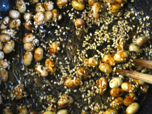 ②色が変わって茶色っぽくなると火を弱めてごま油と醤油を加えてひと混ぜして、大豆と胡麻を加えて手早く混ぜる。