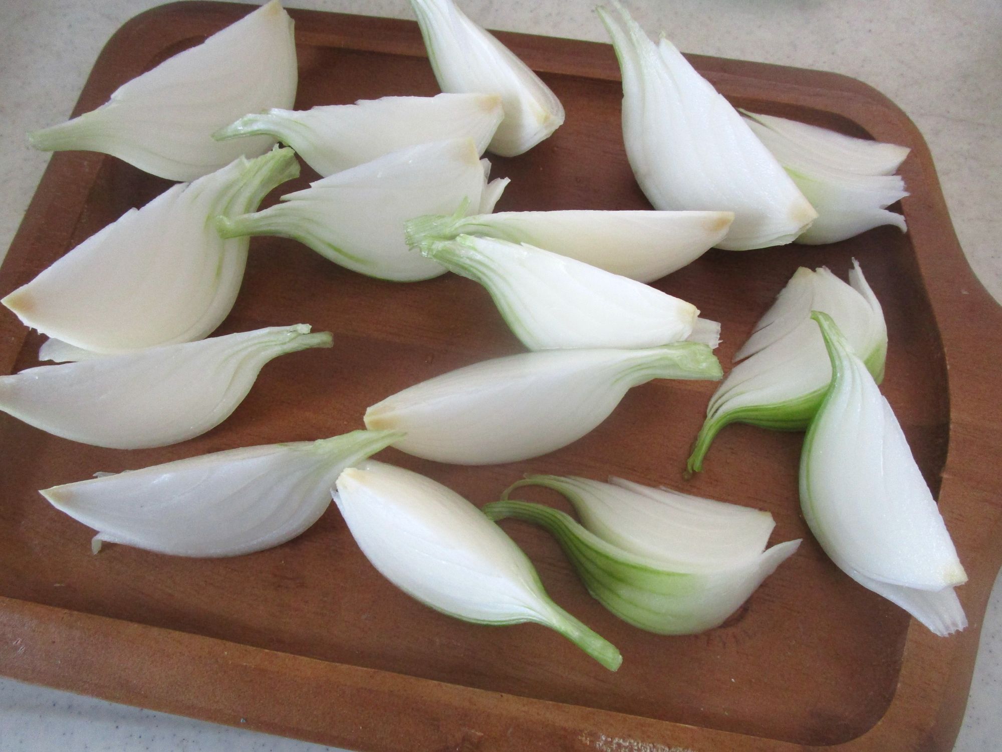 ①玉ねぎは縦6~8等分のくし形切りにする。
