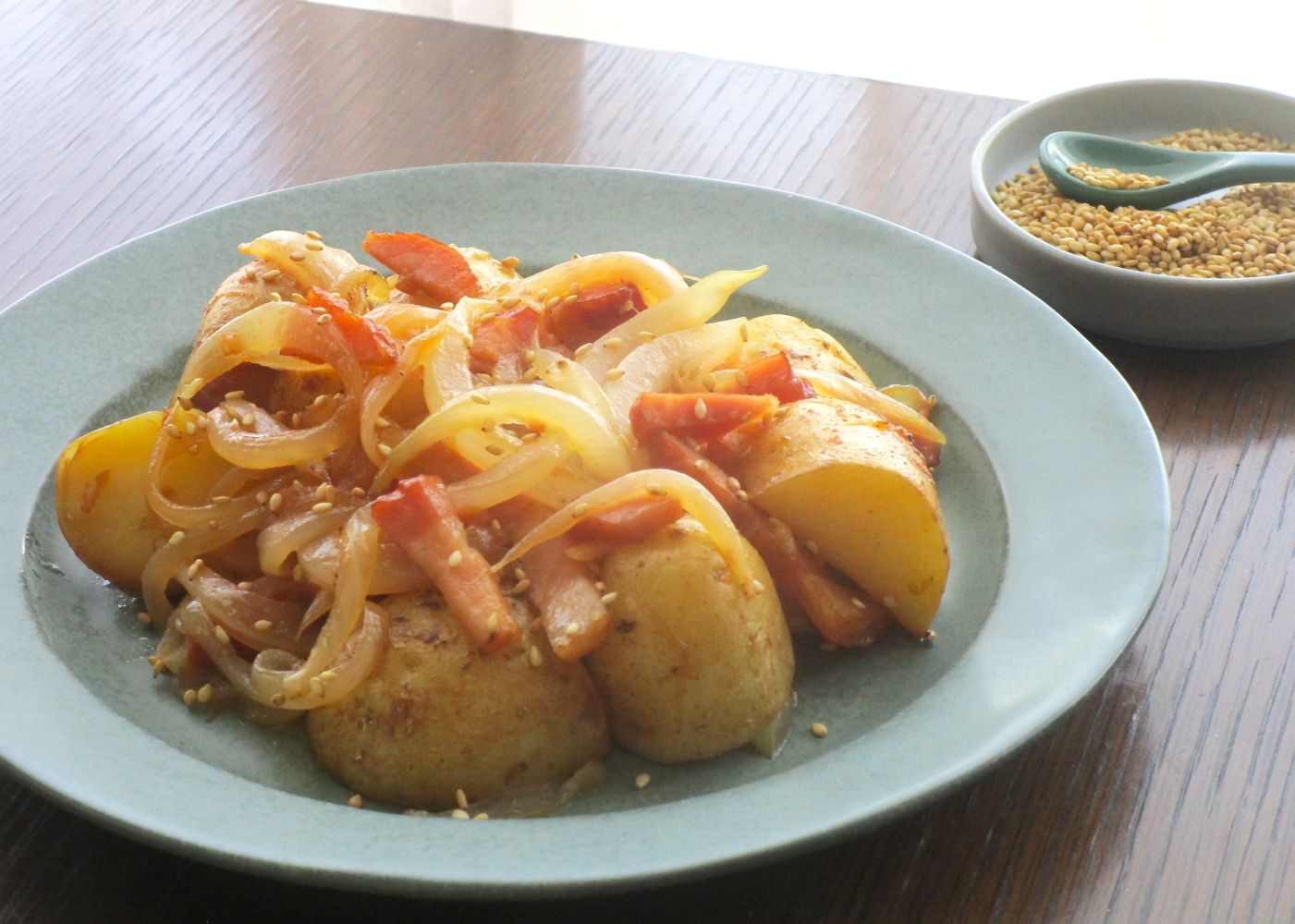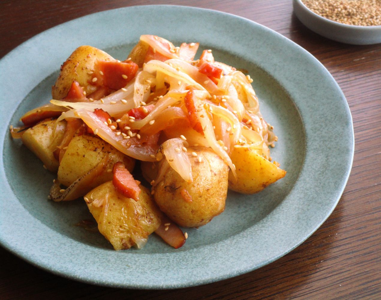 ③フライパンにエキストラバージンごま油とにんにくを入れて弱火で熱し、香りが立つと①のじゃが芋を入れて塩を全体にふりかけて炒める。ベーコンとこしょうも加えて炒め、じゃが芋に軽く焼き色がつくと、玉ねぎも加える。