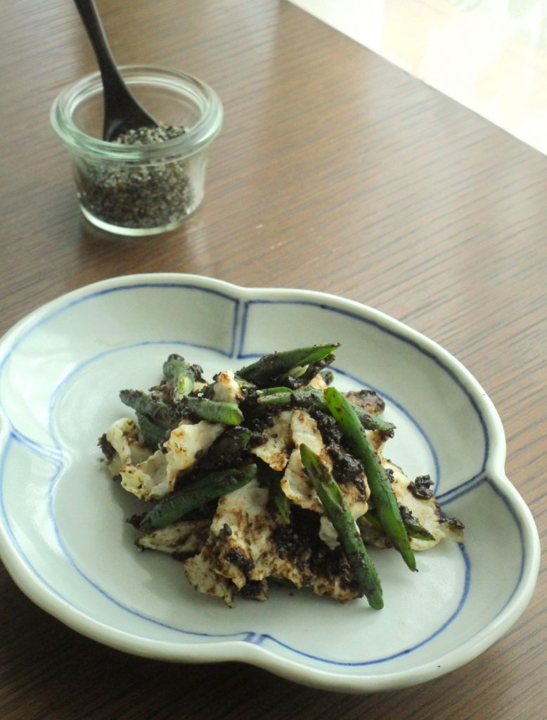 ①三度豆は洗って、塩二つまみをふりかけて軽くもみこみ、そのまま熱湯でゆでる。(シャキッと感が残るくらい。約2分)ザルに広げて冷まして食べやすく斜め切りにする。