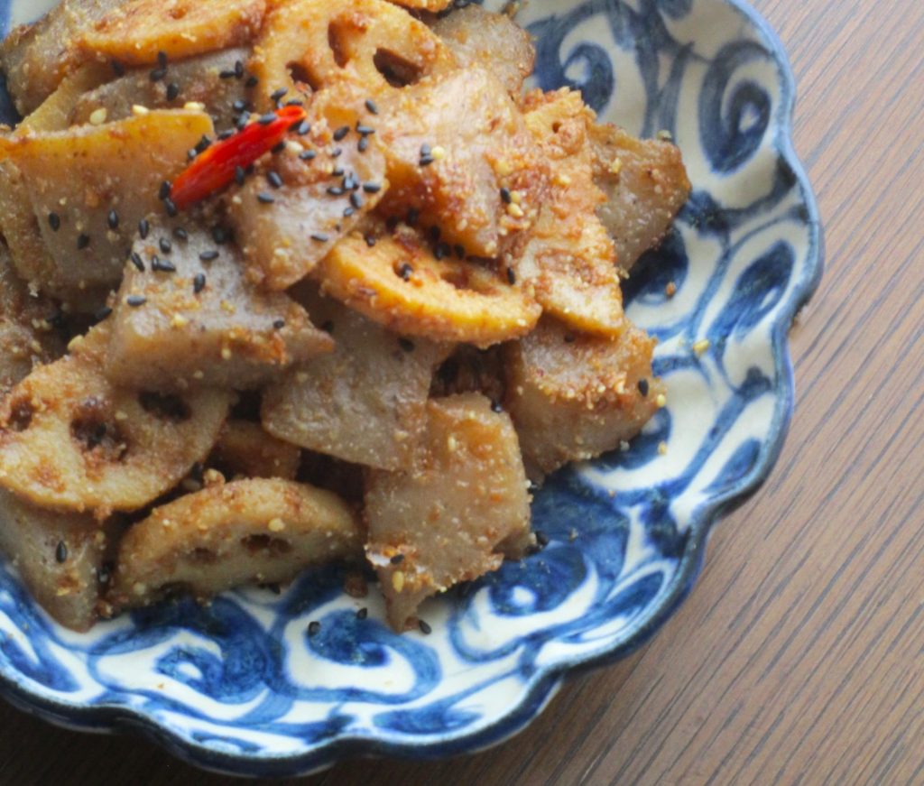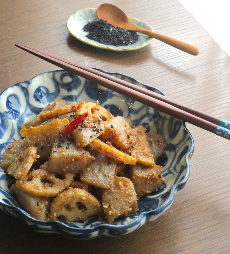 むちっシャキッとしたれんこんを合わせた、ごま風味の煮物を紹介いたします。