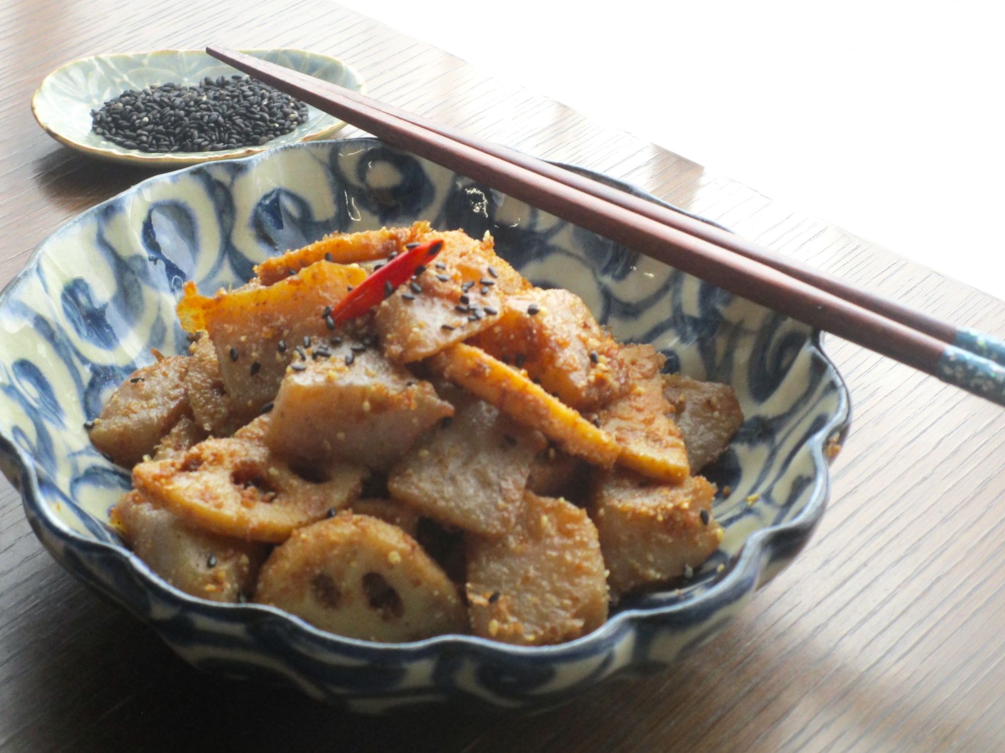③れんこんを加え、塩一つまみを全体にふりかけてひと炒めする。Aの調味料を加えて煮からめる。汁気が少なくなると、すりごまを加えて煮汁を吸わせながら全体によく混ぜる。