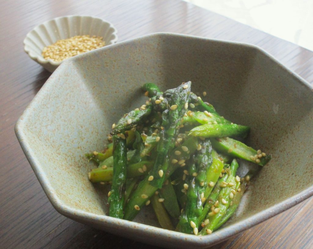 ②フライパンにごま油を熱し、アスパラガスを入れ、塩をふりかけて強めの火で炒め、緑色が鮮やかになるとAを加えてからめ、削り節とごまを振りかけてひと混ぜして器に盛る。