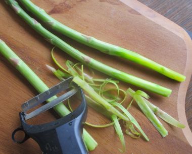 ①アスパラガスは根元のかたい部分を切り落とし、根元の皮を7~8cmピーラーでむく。
