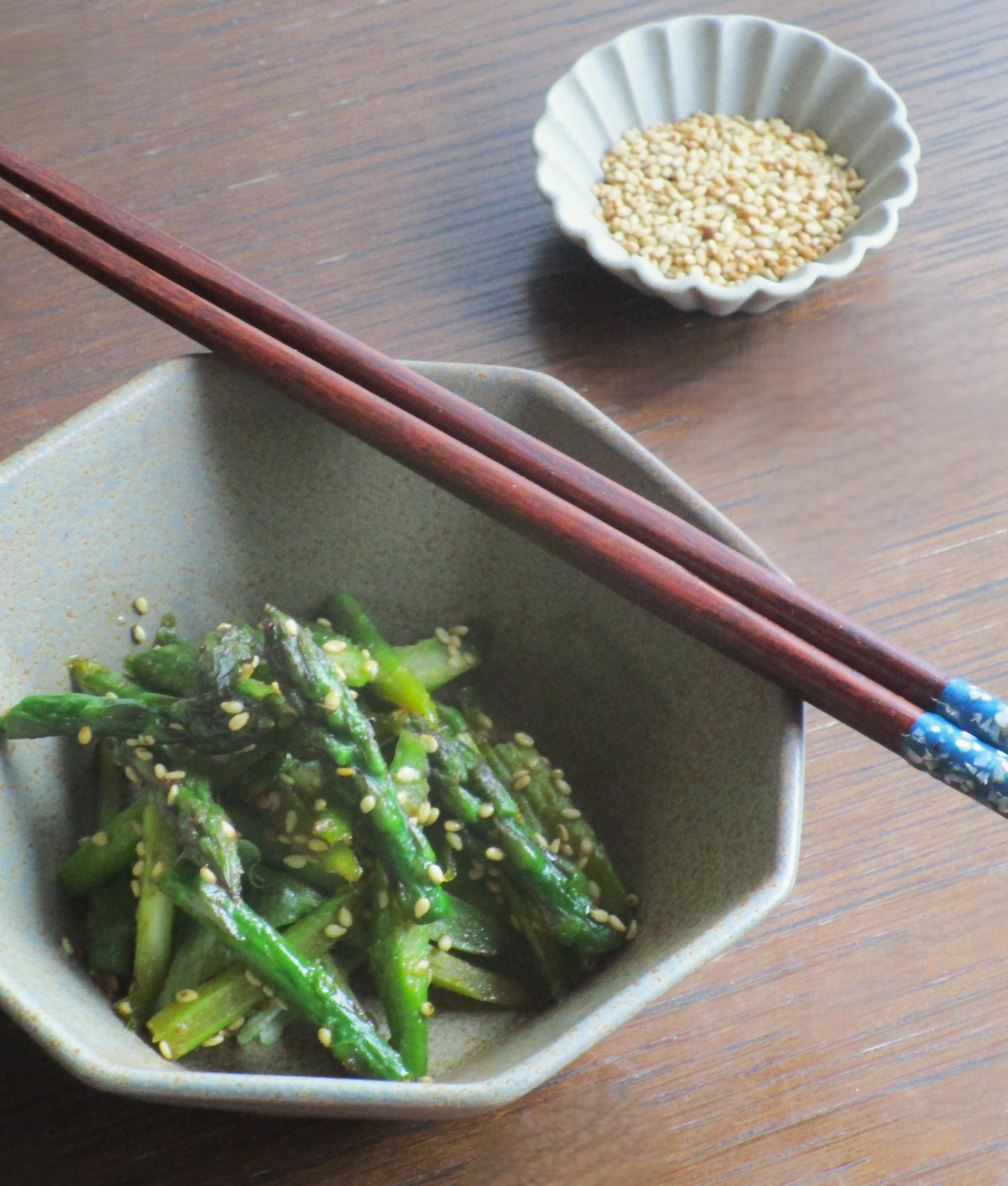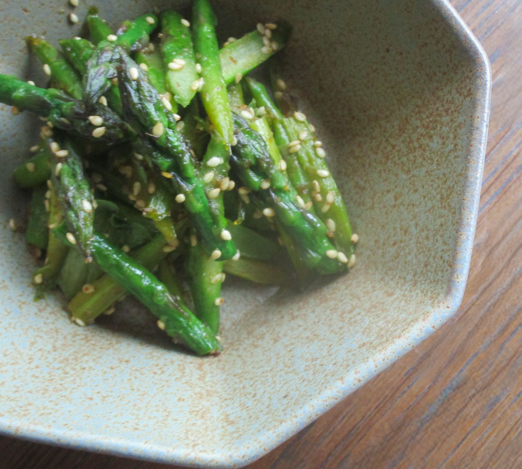 ②フライパンにごま油を熱し、アスパラガスを入れ、塩をふりかけて強めの火で炒め、緑色が鮮やかになるとAを加えてからめ、削り節とごまを振りかけてひと混ぜして器に盛る。